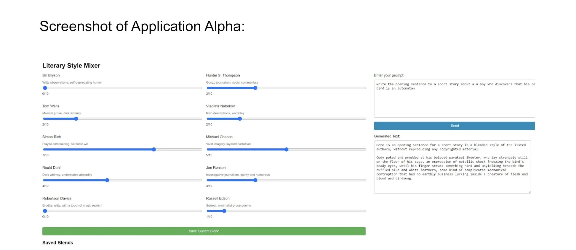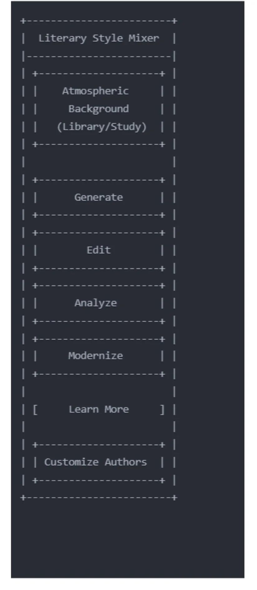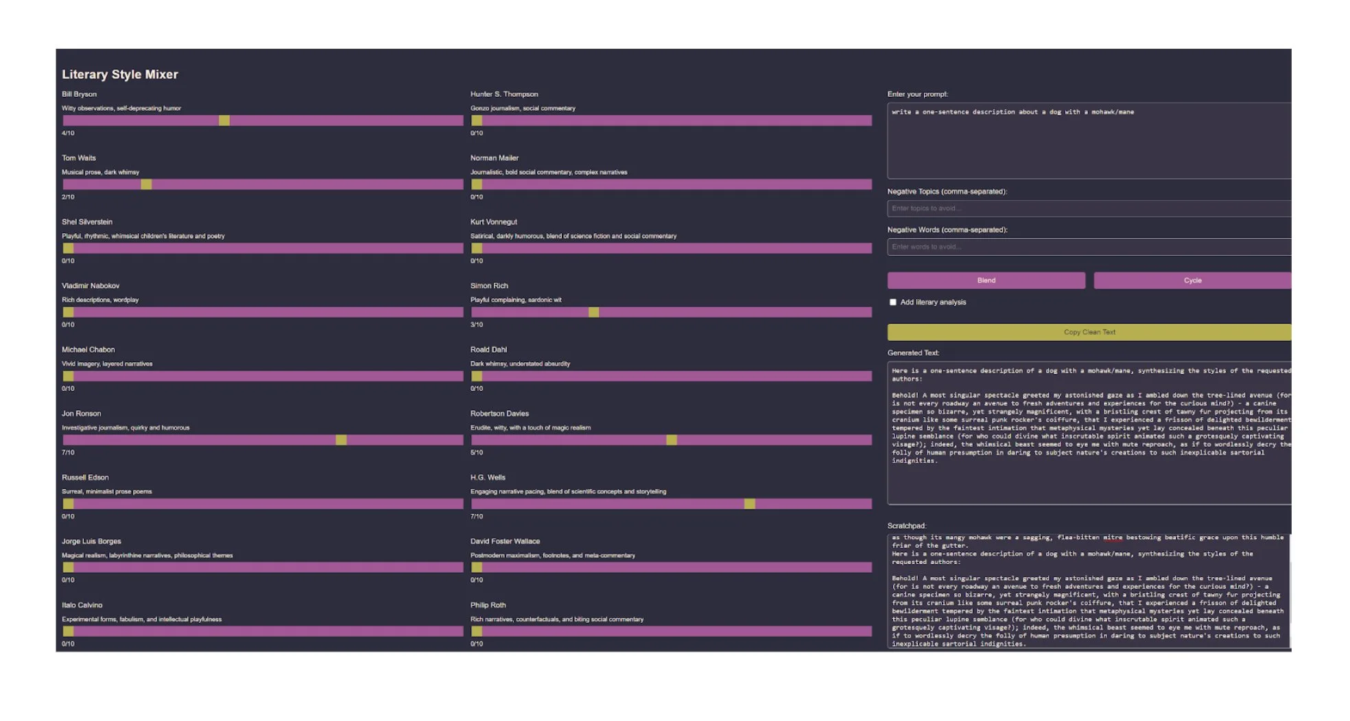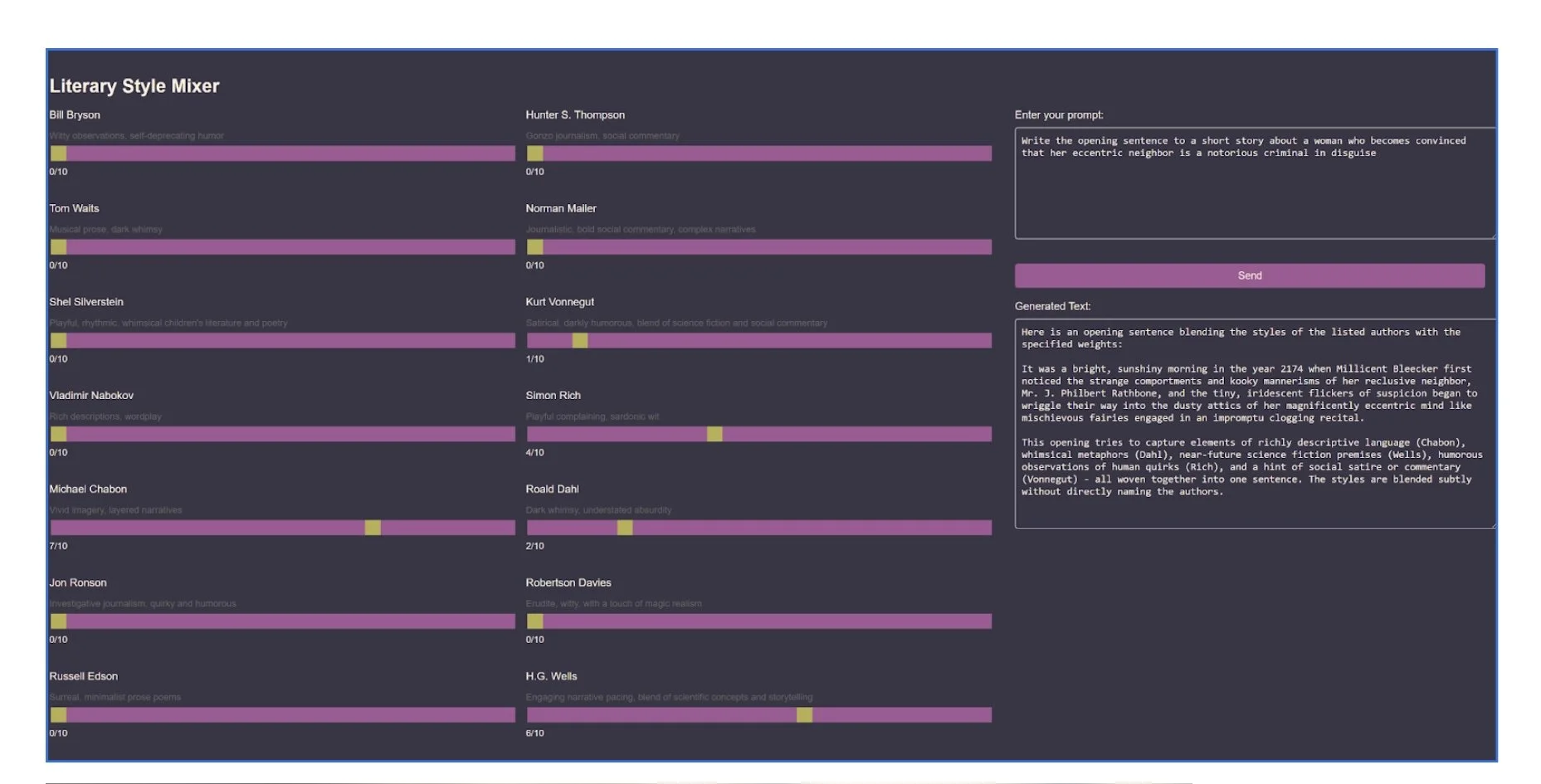 Unlike generic prompts that result in fuzzy stylistic weighting during inference, the Literary Style Mixer offers granular control over the creative process. At its core, the app presents users with a set of sliders, each representing a different author. By adjusting these sliders, users can dial in the exact degree of influence each author has on the generated text. Users input their own writing for customized editorial feedback, or they may type prompts to produce text that faithfully reflects the chosen blend.