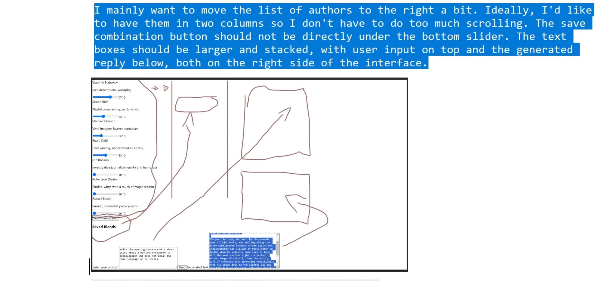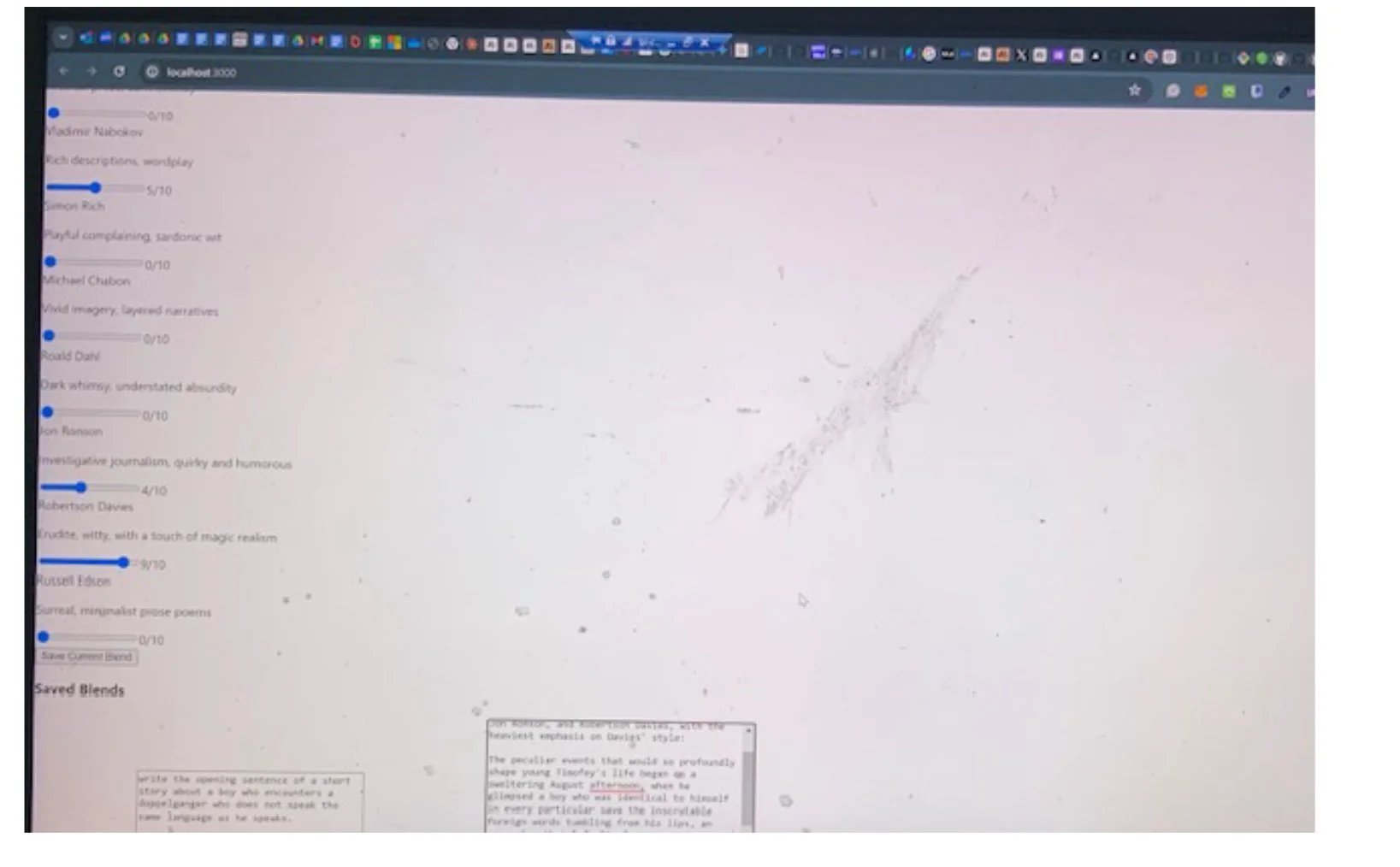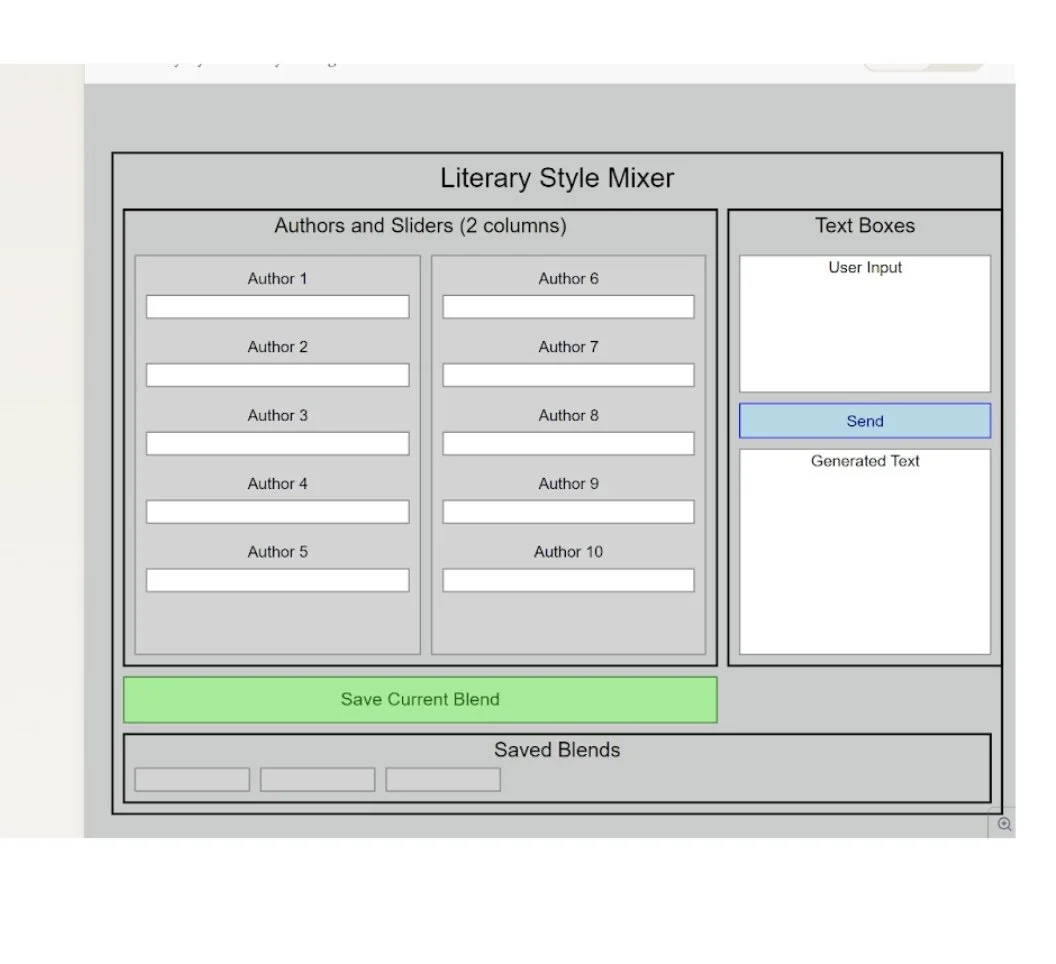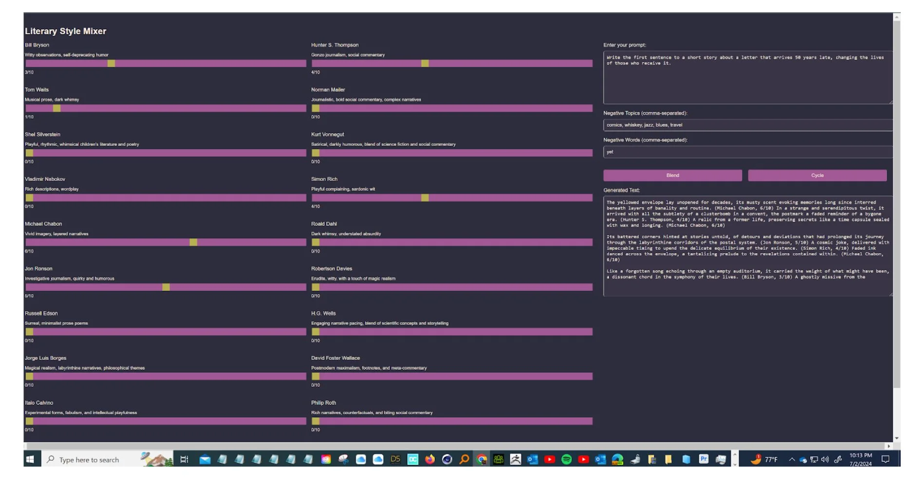 Unlike generic prompts that result in fuzzy stylistic weighting during inference, the Literary Style Mixer offers granular control over the creative process. At its core, the app presents users with a set of sliders, each representing a different author. By adjusting these sliders, users can dial in the exact degree of influence each author has on the generated text. Users input their own writing for customized editorial feedback, or they may type prompts to produce text that faithfully reflects the chosen blend.