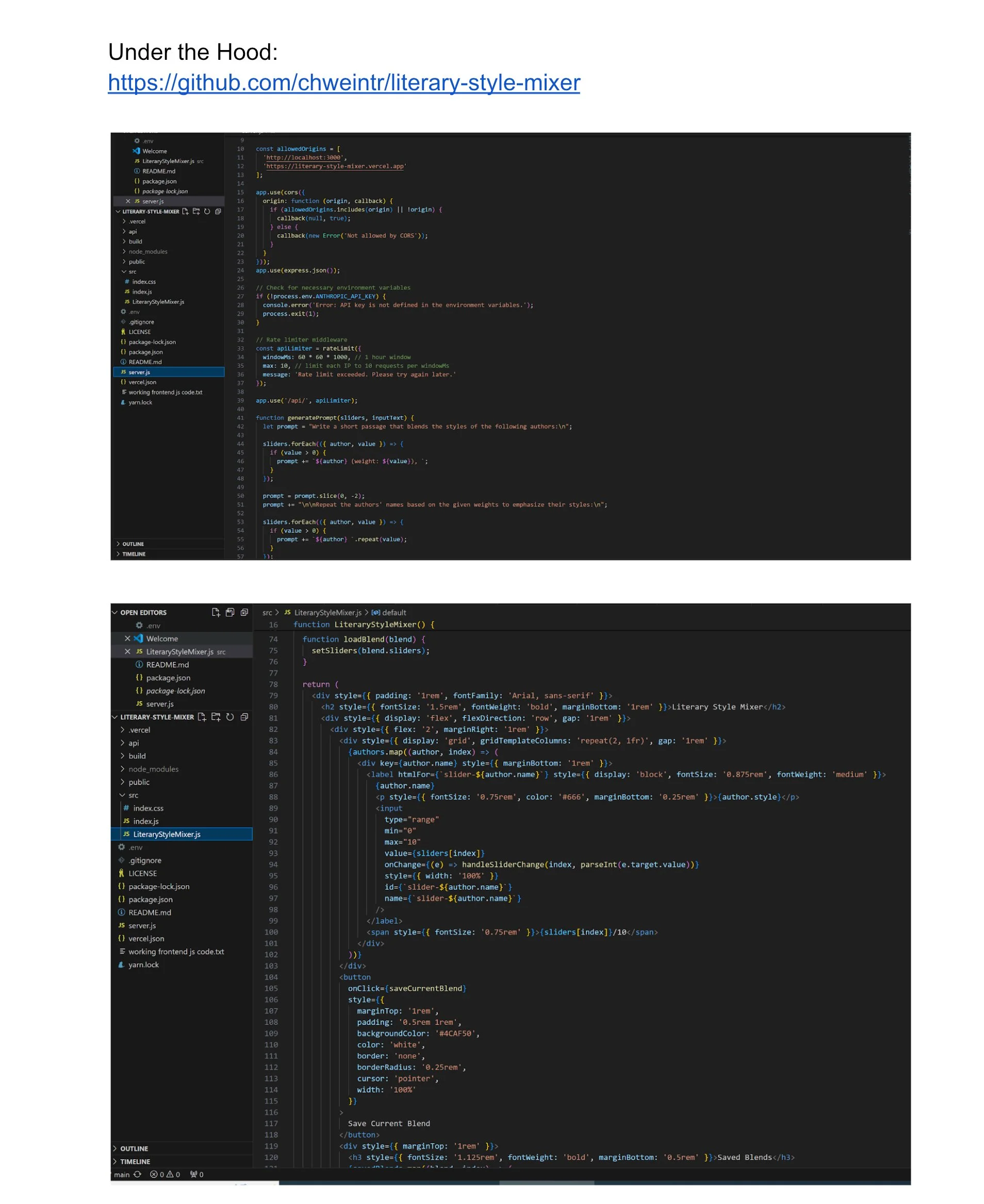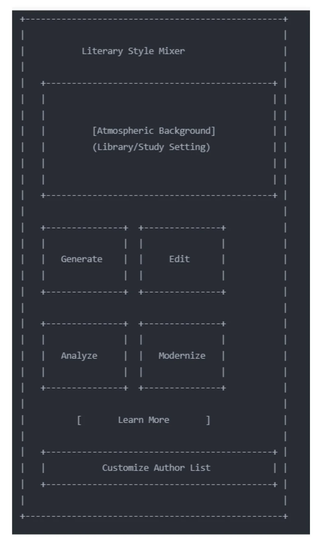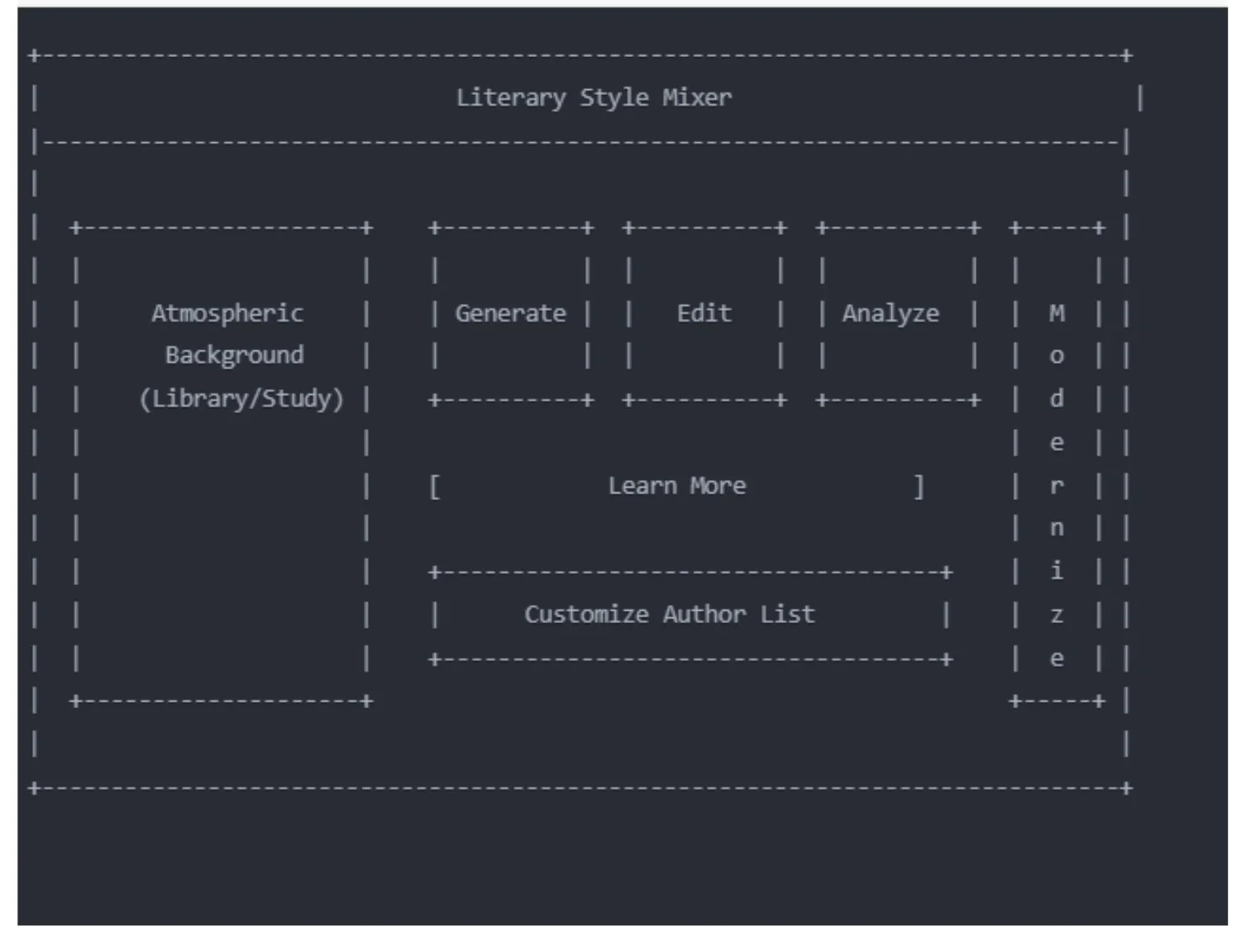 This project represents a starting point for exploring the intersection of AI, literature, and creative writing. The Literary Style Mixer invites users to engage with literary exploration and innovation, whether used for brainstorming, editing, or simply playing with language. It stands as a testament to the potential of AI in assisting creative processes and democratizing software development, offering a glimpse into a future where AI becomes an integral part of the creative toolkit.