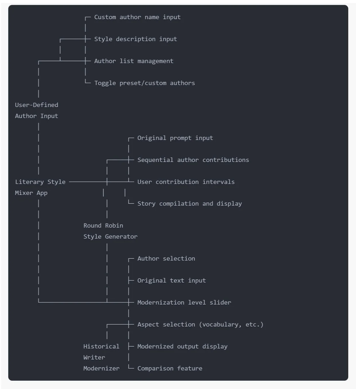 These functions will build upon the language model's initial training while addressing limitations during inference, resulting in more nuanced and accurate style blending. By implementing these features, the Literary Style Mixer could evolve into a comprehensive platform for creative writing experimentation, education, and collaboration.
