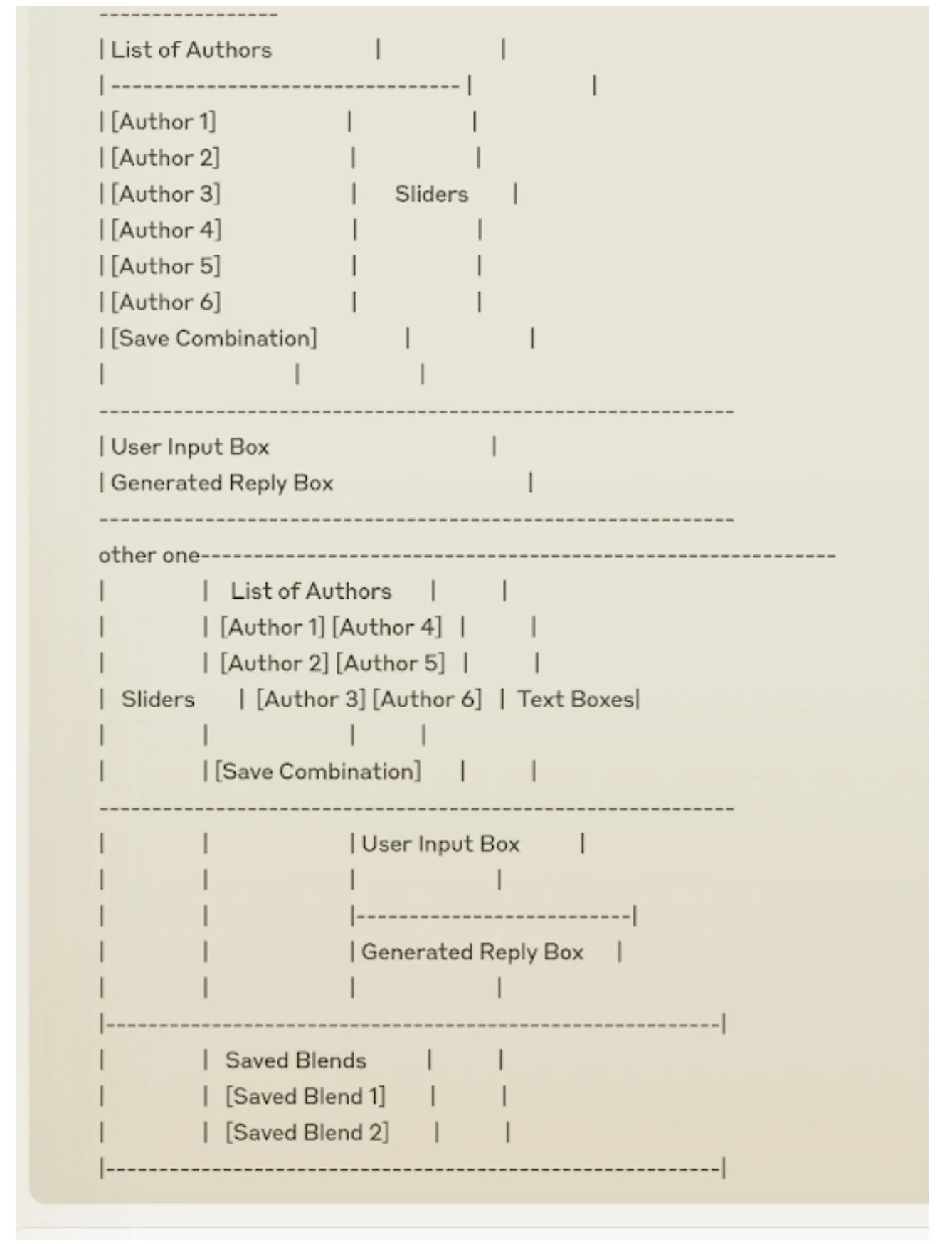 Whether or not you agree that this application is ethically alright or useful at all or that there are legitimate opportunities for learning and internalizing through engaging with a customizable synthetic mashup of one’s literary heroes, the real story here is that an individual with no training, new to the coding language, could go from zero—a flicker of an idea—to a functional application in mere days. And that it is only on account of these latest developments in AI, a noteworthy upgrade to an interface, a bit of disregard for personal maintenance, some good old blind recklessness, and caffeine-induced audacity that such a thing could ever come about.