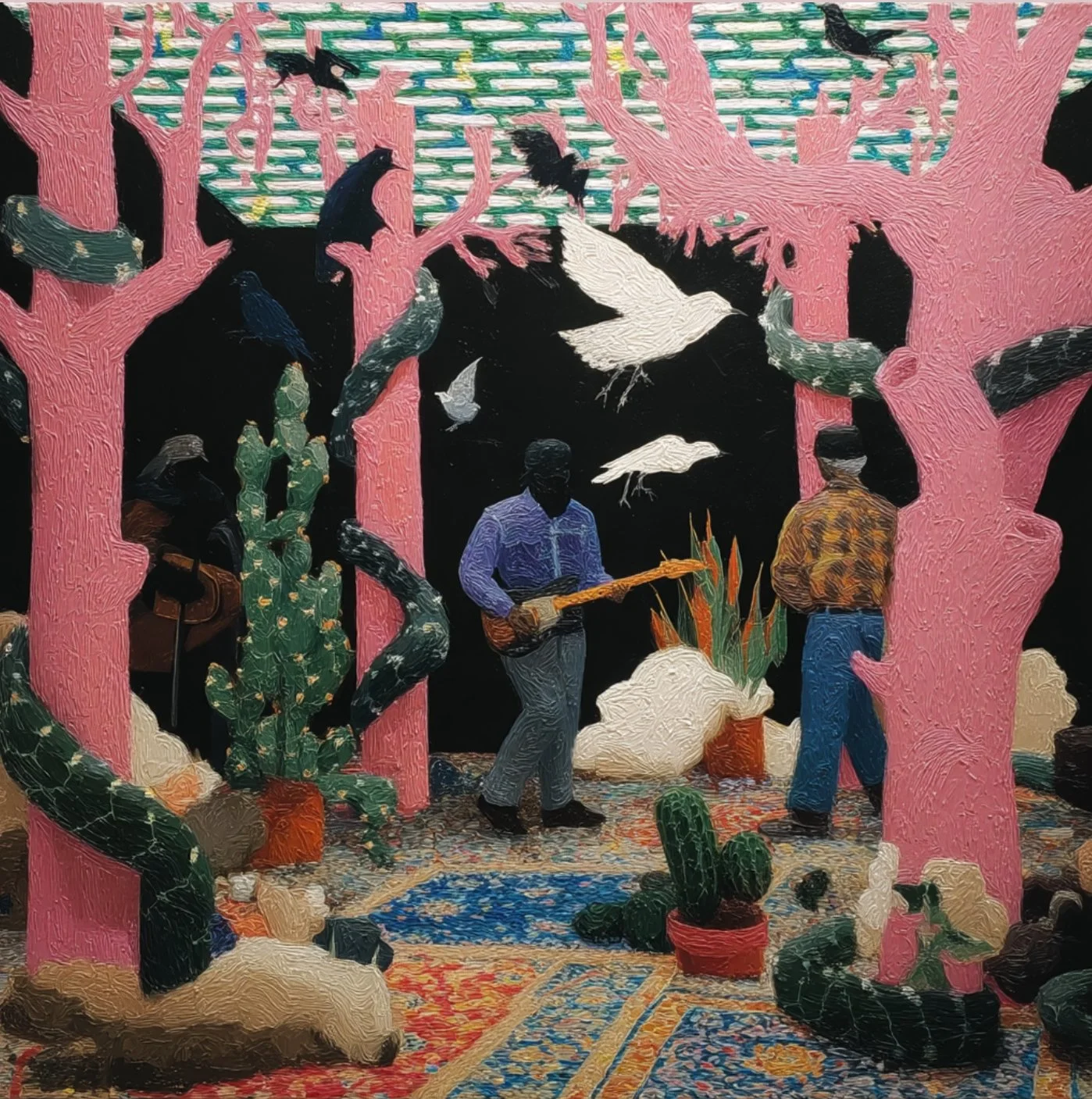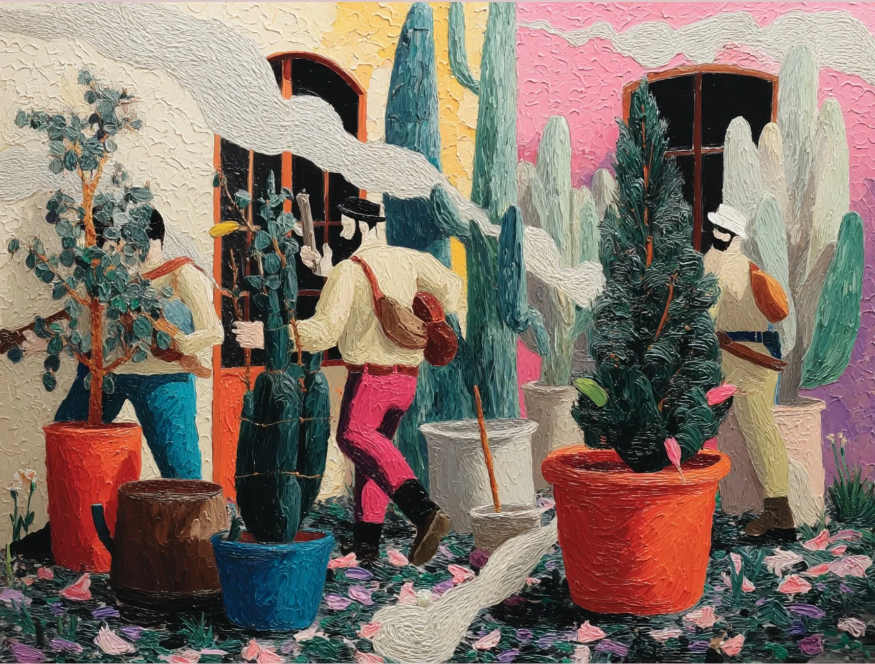 Marauders Watering the Plants ,Oil, Acrylic, and Epoxy Clay on panel, 2025